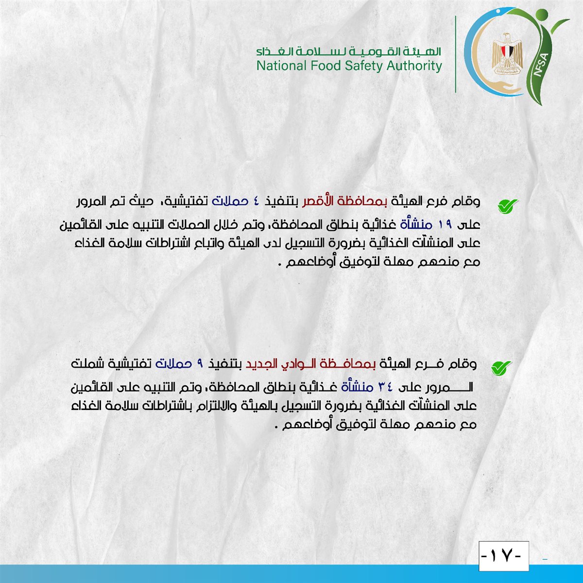 وقام فرع الهيئة بمحافظة الأقصر بتنفيذ 4 حملات تفتيشية، حيث تم المرور على 19 منشأة غذائية بنطاق المحافظة، وتم خلال الحملات التنبيه على القائمين على المنشآت الغذائية بضرورة التسجيل لدى الهيئة واتباع اشتراطات سلامة الغذاء مع منحهم مهلة لتوفيق أوضاعهم.
