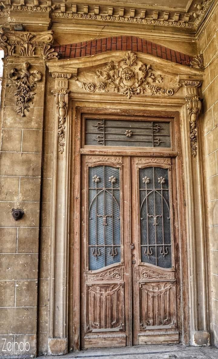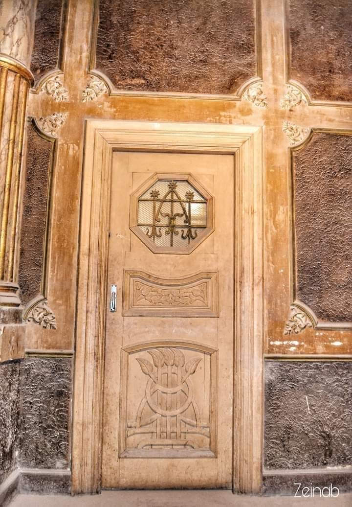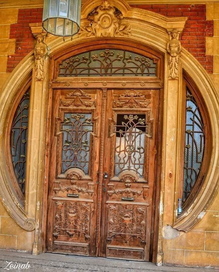 بوابة الدخول الرئيسية: بوابة دائرية بفتحة مستطيلة يعلوها عقد موتور يتوجه كورنيش مزين بزخرفة المحارة (الصدفة) وفروع نباتية مورقة. الكورنيش محمول على نحت قالبي لسيدتين عاريتين تمسكان حلقة مستديرة. الباب الخشبي مصراعان بزجاج معشق ومصبعات حديدية مزخرفة بأشكال نباتية ووجه آدمي.