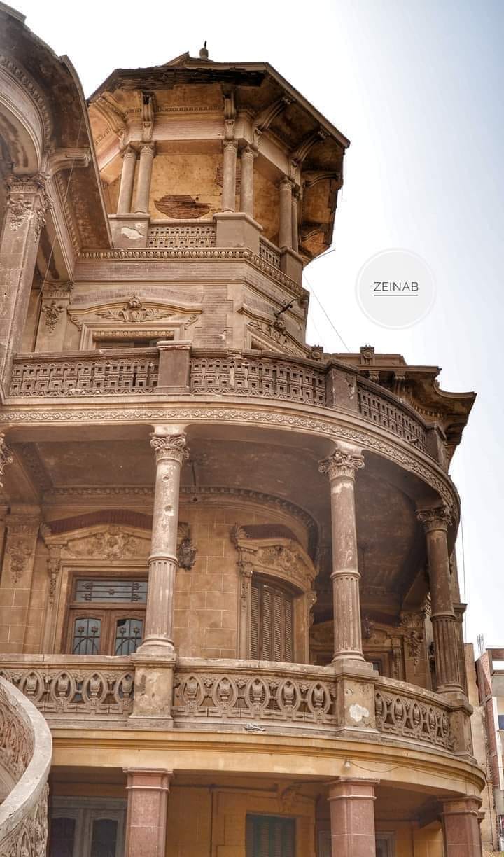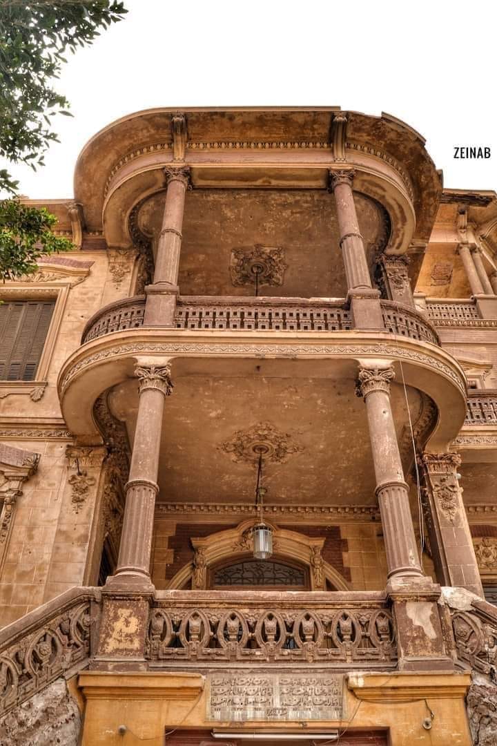 تنقسم لثلاثة أقسام، ويقع في الطرف الجنوبي الغربي برج أسطواني. يتميز القسم الأوسط باستدارة في الأركان وببروز قليل، وتتكرر فيه زخرفة الأسبانيوليت على نوافذ البدروم و فرنتونات مقوسة مزينة بعناصر المحارة والمراوح النخيلية على نوافذ الطابقين الأول والثاني، مع زخارف الأكانتس على الفرنتونات العلوية. البرج الأسطواني مبني بالآجر ومكسي بالملاط الأصفر، ويتوج بجوسق ذي ستة أعمدة أيونية تعلوه قمة مخروطية من الخشب مزينة بزخرفة قشر السمك يتوجها نسر من الخشب.