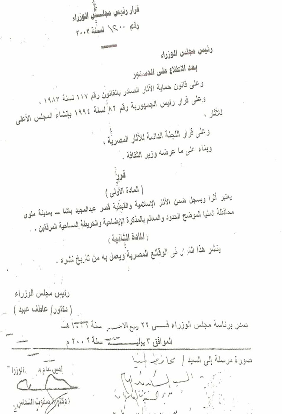 وحصل نيوز رووم على مستند يفيد بتشكيل لجنة تعمل على تقييم حالة القصر، وجاء في قرار تشكيل اللجنة التالي: مادة ثانية: "تكون مهمة اللجنة المعاينة الفنية لقصر عبد المجيد باشا الأثرى بمدينة ملوى - محافظة المنيا - والوقوف على والوقوف على مدى قيمته التاريخية أو العلمية أو الدينية أو الفنية أو الأدبية للعقار الأثري، تمهيداً لاتخاذ القرار المناسب بشأنه، مع إعداد تقرير واف للعرض على السلطة المختصة واستيفاء الإجراءات القانونية اللازمة، وعلى اللجنة إعداد تقرير فنى مفصل بنتيجة أعمالها والإجراءات التوصيفية اللازمة، وعلى الجهات المختصة تنفيذ هذا القرار كلٌ فيما يخصه.