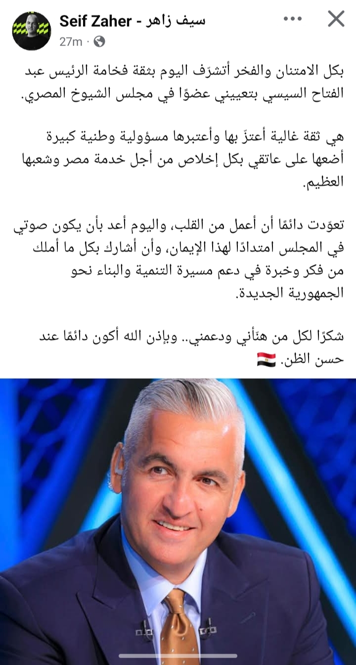 سيف زاهر يوجّه الشكر للرئيس السيسي بعد تعيينه عضوًا بمجلس الشيوخ: «ثقة غالية»