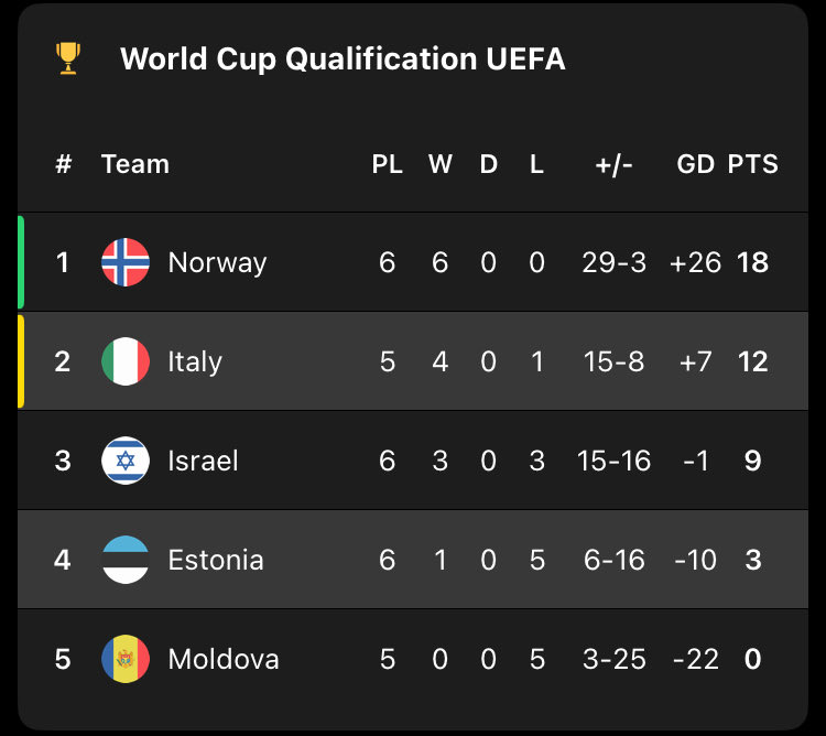 بتلك النتيجة، رفع منتخب إيطاليا رصيده للنقطة 12 بالمركز الثاني خلف المتصدر منتخب النرويج، فيما حل منتخب إستونيا بالمركز الرابع بجدول ترتيب المجموعة السابعة برصيد 3 نقاط فقط.