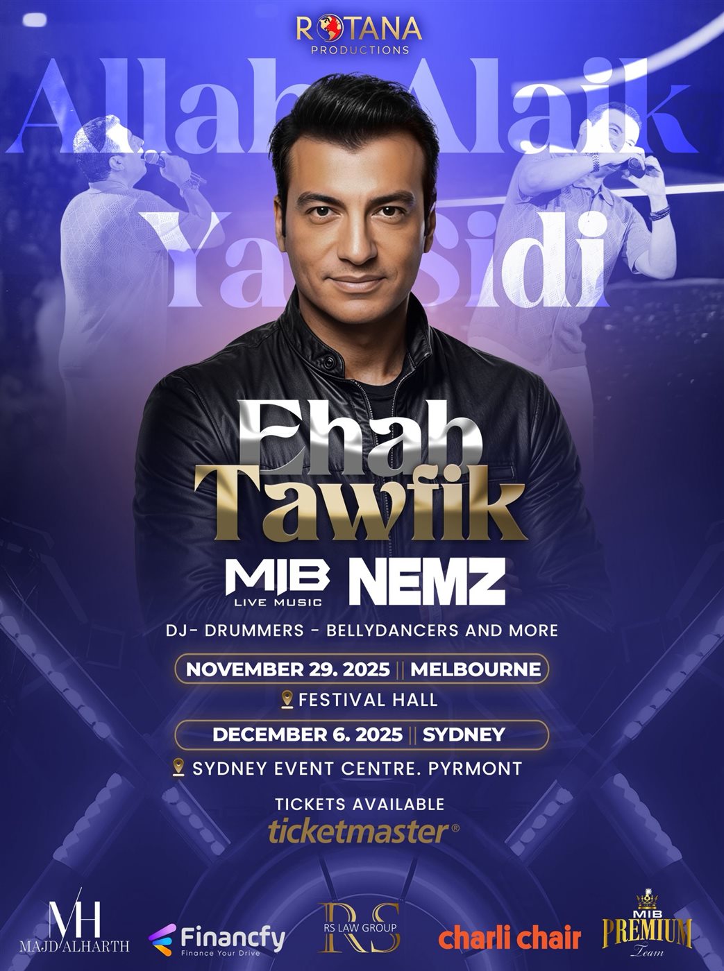 يحيي النجم المصري إيهاب توفيق حفلين غنائيين كبيرين للجاليات العربية في مدينتي ملبورن وسيدني، وتعد أولى هذه الحفلات في ملبورن يوم 29 من شهر نوفمبر القادم، والثانية يوم 6 من ديسمبر في مدينة سيدني، وتعد الحفلين من تنظيم روتانا برودكشنز المتخصصة في تنظيم حفلات العرب والمصريين في استراليا وأوروبا، وشكل الإقبال الجماهيري الغير مسبوق على الحفلين دافعا المنظمين لاستئجار ملاعب كرة قدم كبيرة لاستيعاب الجماهير التي حجزت الحفلين .