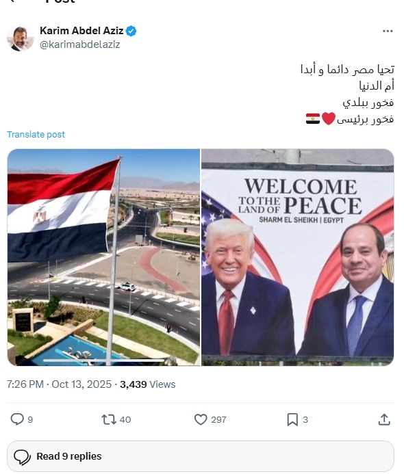 حرص الفنان كريم عبدالعزيز على توجيه الإشادة بالرئيس عبدالفتاح السيسي بعد انعقاد قمة شرم الشيخ للسلام بحضور الرئيس الأمريكي دونالد ترامب.