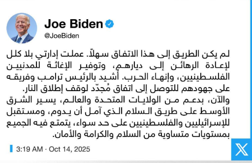 بايدن يشيد بالرئيس ترامب على جهوده في اتفاق غزة
