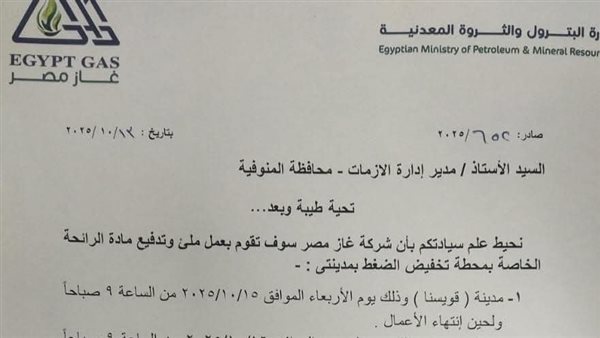 أعلنت شركة غاز مصر أنه سيتم تنفيذ أعمال ملء وتدفيع مادة الرائحة الخاصة بمحطة تخفيض الضغط بمدينة تلا يوم الخميس الموافق 16 أكتوبر 2025، بدءًا من الساعة 9 صباحًا وحتى الانتهاء من الأعمال داخل المحطة.