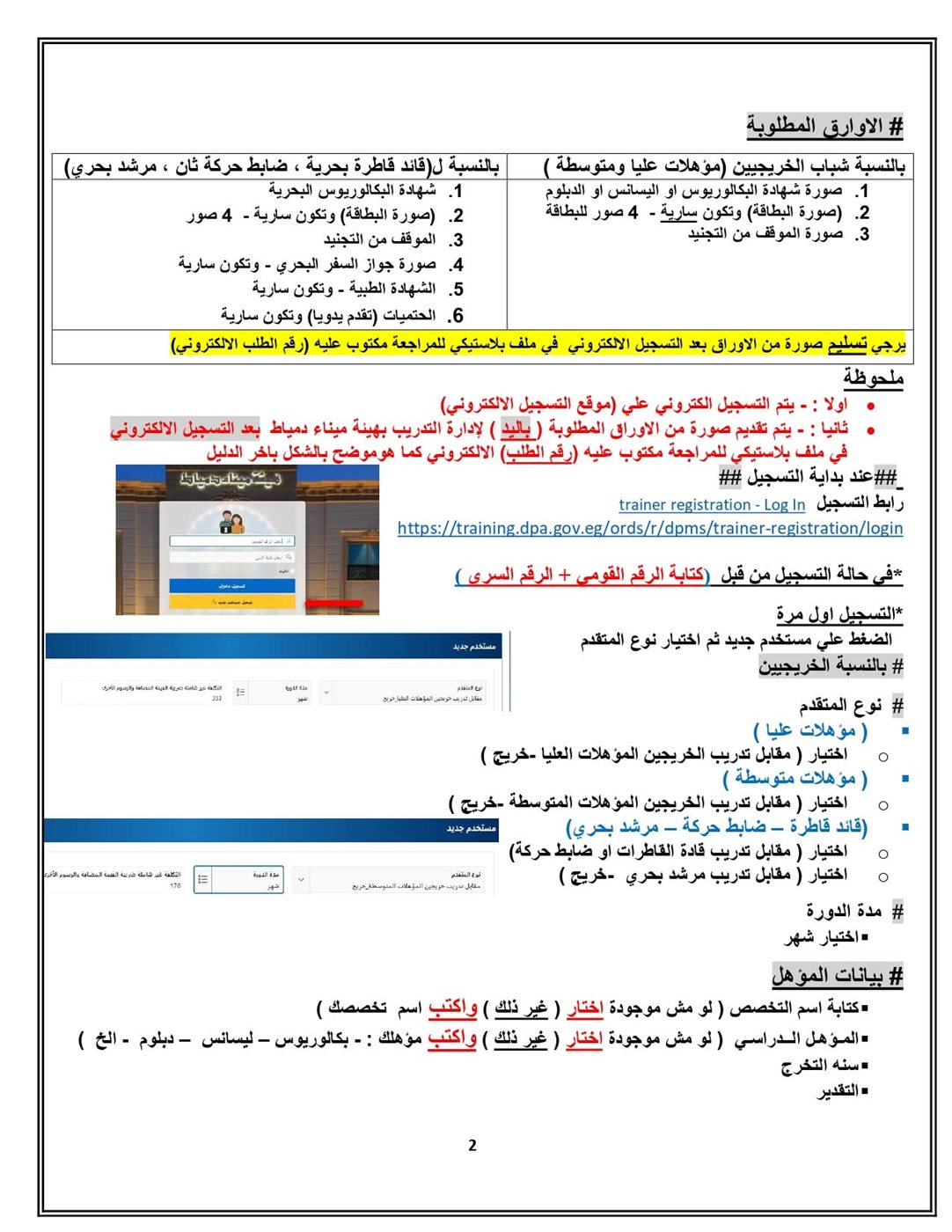 وأوضحت الهيئة أن باب التقديم سيُفتح رسميًا اعتبارًا من يوم الثلاثاء 15 أكتوبر 2025 ويستمر حتى 30 أكتوبر 2025 عبر الموقع الإلكتروني الرسمي للتدريب التابع لهيئة ميناء دمياط من خلال الرابط: https://training.dpa.gov.eg/ords/r/dpms/trainer-registration/login، حيث يتم التسجيل إلكترونيًا وفق الخطوات الموضحة في دليل المستخدم المنشور على صفحة الهيئة الرسمية، وذلك تسهيلًا على الراغبين في الالتحاق دون الحاجة إلى الحضور المباشر لمقر الهيئة.