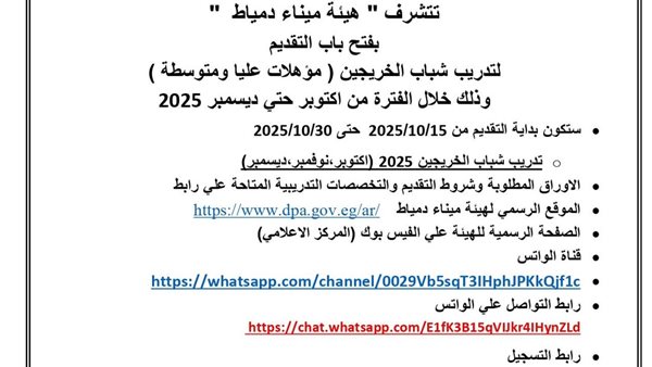 في إطار الدور المجتمعي الذي تقوم به هيئة ميناء دمياط وحرصها على دعم الشباب وتأهيلهم لسوق العمل، أعلنت الهيئة عن فتح باب التقديم لتدريب شباب الخريجين من أصحاب المؤهلات العليا والمتوسطة، وذلك خلال الفترة من أكتوبر وحتى ديسمبر 2025، في خطوة تهدف إلى تمكين الشباب وتنمية مهاراتهم العملية من خلال برامج تدريبية متخصصة داخل الميناء وفي الإدارات المختلفة التابعة له.