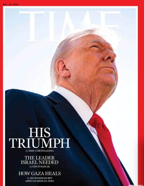 وكانت المجلة قد كشفت عن الغلاف أمس الاثنين، تزامنًا مع زيارة ترامب إلى إسرائيل حيث التقى عائلات الرهائن المفرج عنهم، وألقى خطابًا أمام الكنيست قبل توجهه إلى شرم الشيخ.