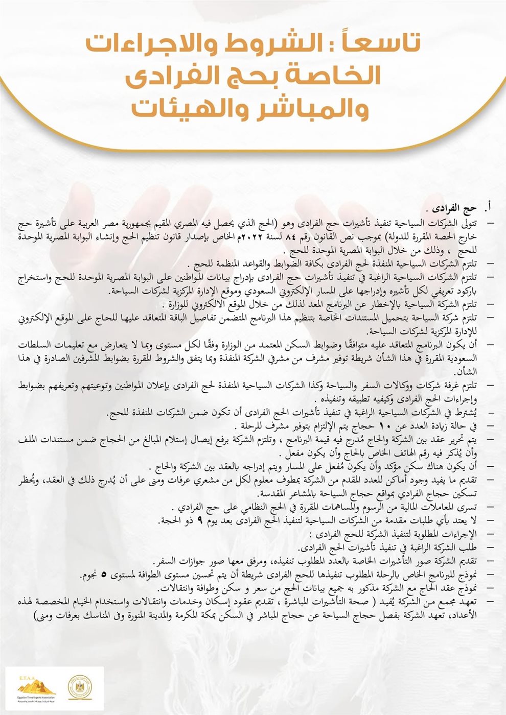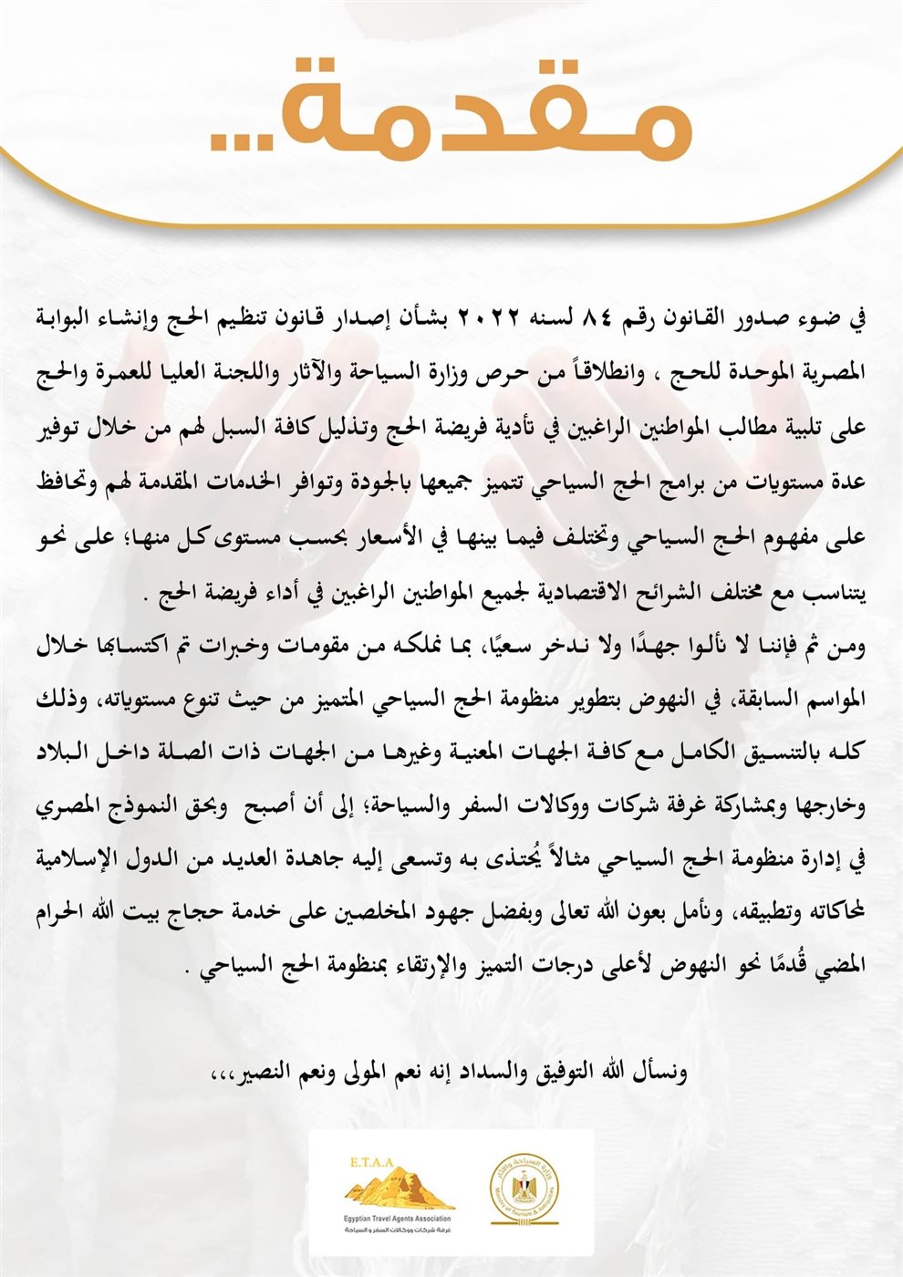 جاء ذلك وفقاً لأحكام قانون 84 لسنة 2022 المنظم للحج، وقانون شركات السياحة رقم 38 لسنة 1977، وبما يضمن تنظيمًا دقيقًا لموسم الحج القادم وتحقيق أعلى مستويات التميز والجودة في الخدمات المقدمة لحجاج السياحة.