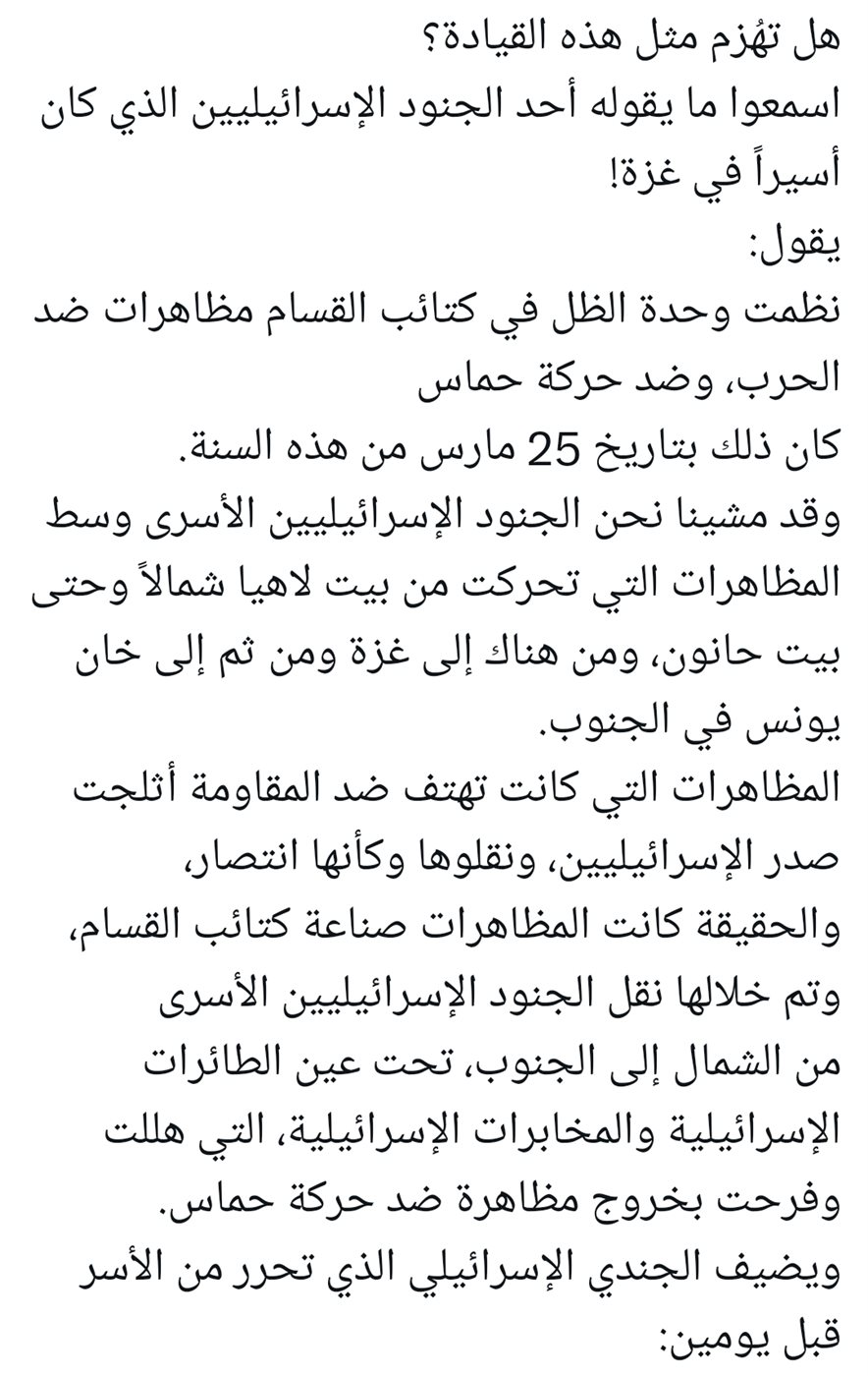 وقال الجندي المحرر في الصفقة تبادل الأسرى الأخيرة، خلال تصريحات عبر وسائل إعلام عبرية، إن "وحدة الظل" التابعة لكتائب القسام نظمت مظاهرات ضد الحرب وضد حركة حماس بتاريخ 25 مارس الماضي، موضحا أن المظاهرات انطلقت من بيت لاهيا شمالا مرورا ببيت حانون وغزة وصولا إلى خان يونس جنوبا.
