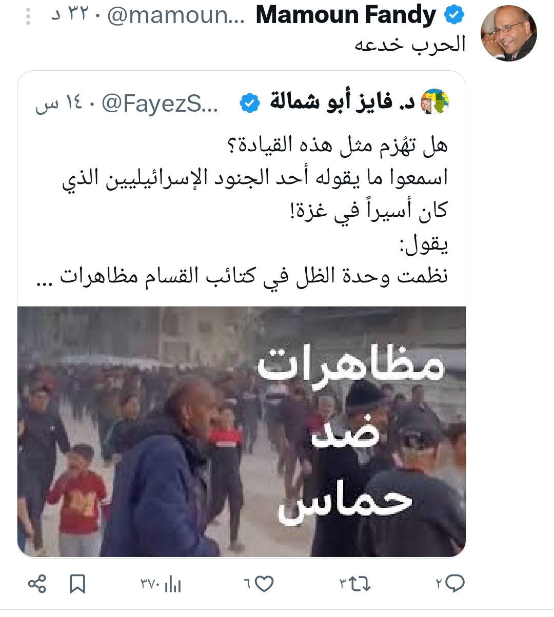 وأشار إلى أن عناصر القسام طلبوا من الأسرى قيادة المظاهرات وترديد هتافات بالعربية ضد المقاومة، بينما كان مقاتلو القسام يرددون الهتافات من خلفهم لتكتمل الخدعة البصرية والإعلامية.