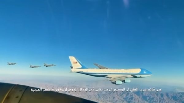 وتضمن الفيديو مشاهد لوصول طائرة الرئاسة الأمريكية إلى المجال الجوي المصري، حيث رافقتها مقاتلات تابعة للقوات الجوية المصرية في مشهد يعكس مستوى الجاهزية والاحترافية التي تتميز بها القوات المسلحة المصرية.
