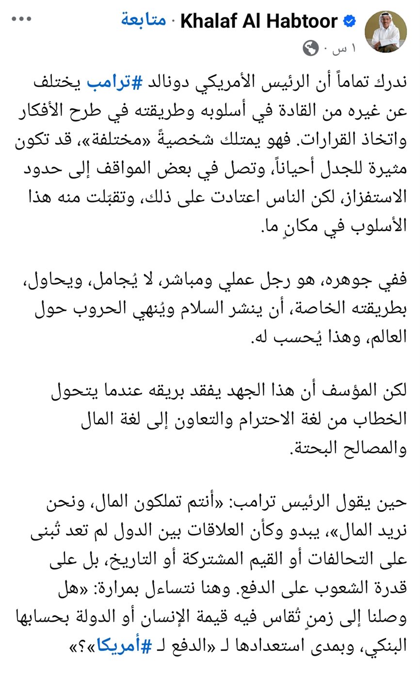 وتابع الحبتور في منشور له عبر حسابه الرسمي على فيسبوك: أن ترامب يمتلك شخصيةً «مختلفة»، قد تكون مثيرة للجدل أحياناً، وتصل في بعض المواقف إلى حدود الاستفزاز، لكن الناس اعتادت على ذلك، وتقبّلت منه هذا الأسلوب في مكانٍ ما.