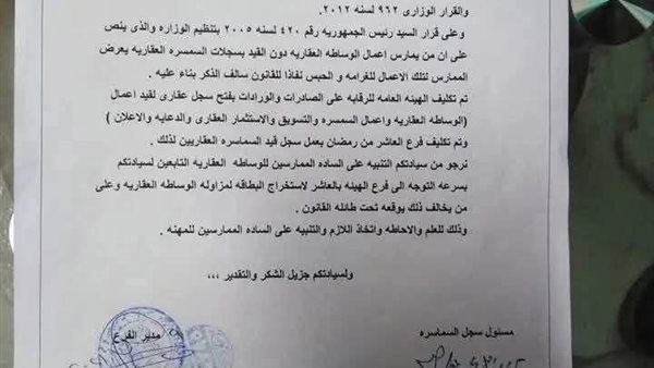 مستند| هيئة الرقابة على الواردات تُلزم "سماسرة العقارات" بالقيد في سجل رسمي