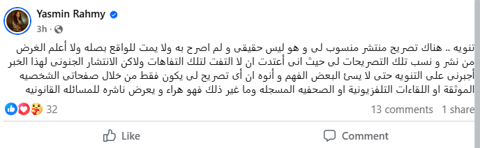 هددت الفنانة ياسمين رحمي بعض الصفحات والمواقع التي تنشر تصريحات لم تصرح بها بالمقاضاة القانونية، حيث نشرت منشورًا تعلن فيه عن ذلك عبر حسابها الرسمي على موقع التواصل الإجتماعي فيسبوك.