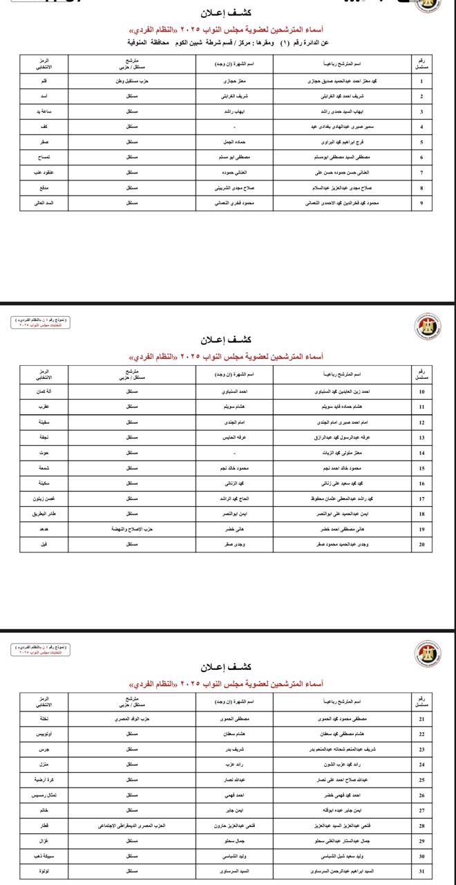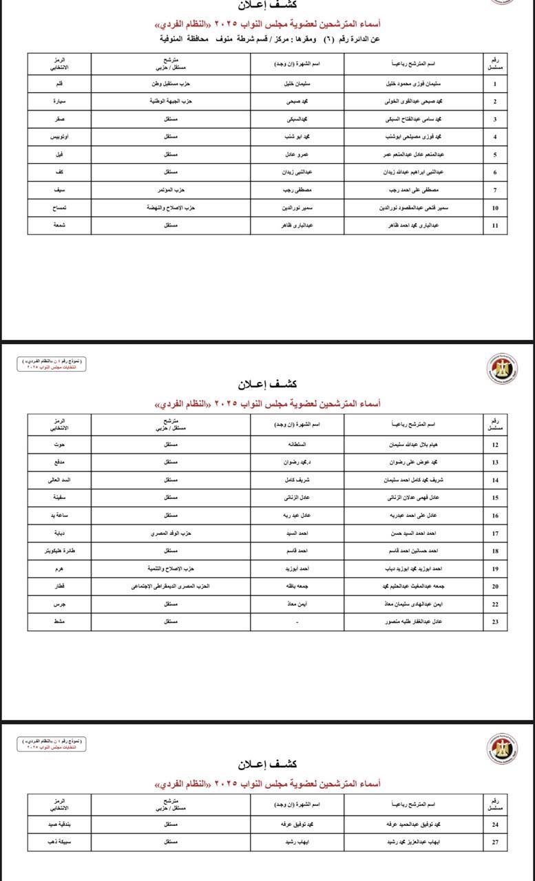 أعلنت الهيئة الوطنية للانتخابات، برئاسة المستشار حازم بدوي، منذ قليل، القائمة الرسمية للمرشحين على النظام الفردي لانتخابات مجلس النواب 2025 بمحافظة المنوفية.