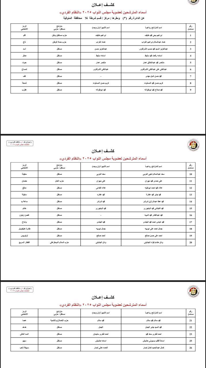 الدائرة الثالثة: مركزا تلا - الشهداء ويتنافس 25 مرشح على مقعدين وهم: