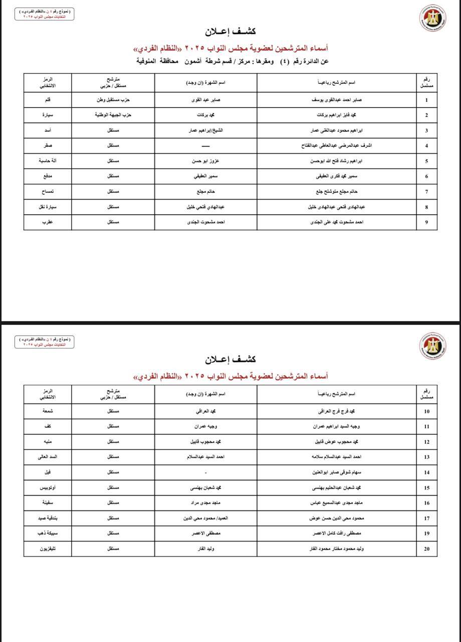 الدائرة الرابعة: مركز أشمون ويتنافس 20 مرشح على مقعدين وهم:
