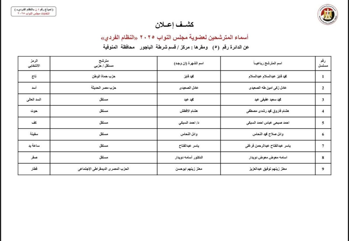 الدائرة الخامسة: مركز الباجور ويتنافس 9 مرشح على مقعد وهم: