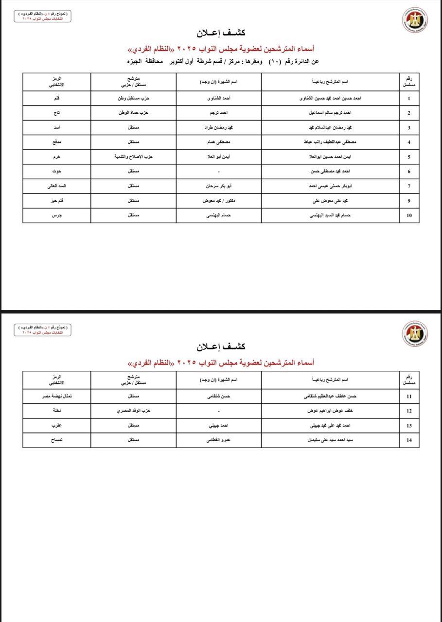 ينشر موقع نيوز رووم بالأسماء المرشحين المتقدمين بأوراق ترشحهم لخوض انتخابات مجلس النواب بـ محافظة الجيزة وتبلغ عدد دوائرها 10 دوائر، وهي كالتالي: