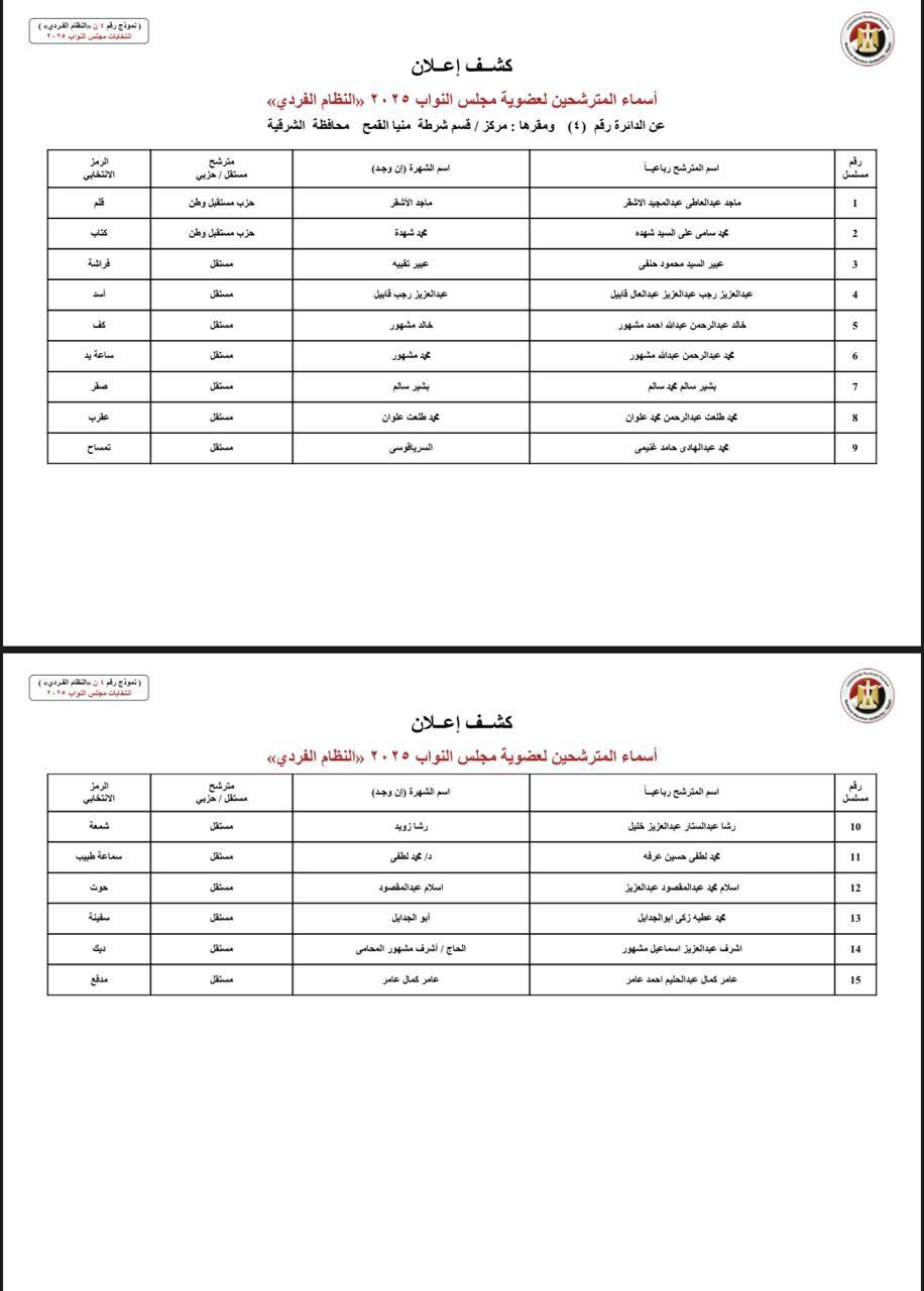 وتضمن الكشفان أسماء المترشحين والصفة التي ثبتت لكل منهم، وحدد الكشف الثاني اسم القائمة التي ينتمي إليها المترشح، على أن يستمر عرض الكشفين على مدار أيام 16 و17 و18 أكتوبر، وتنشرهما الهيئة الوطنية للانتخابات في جريدتي الأخبار والجمهورية.