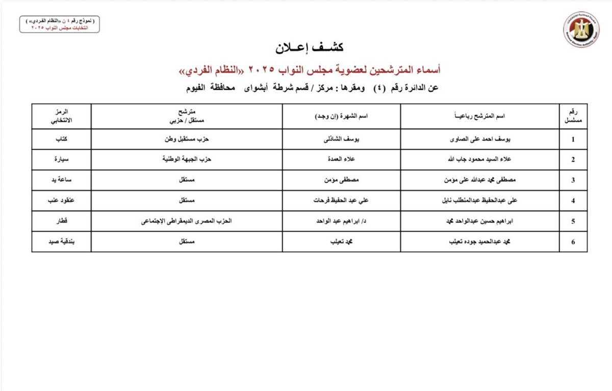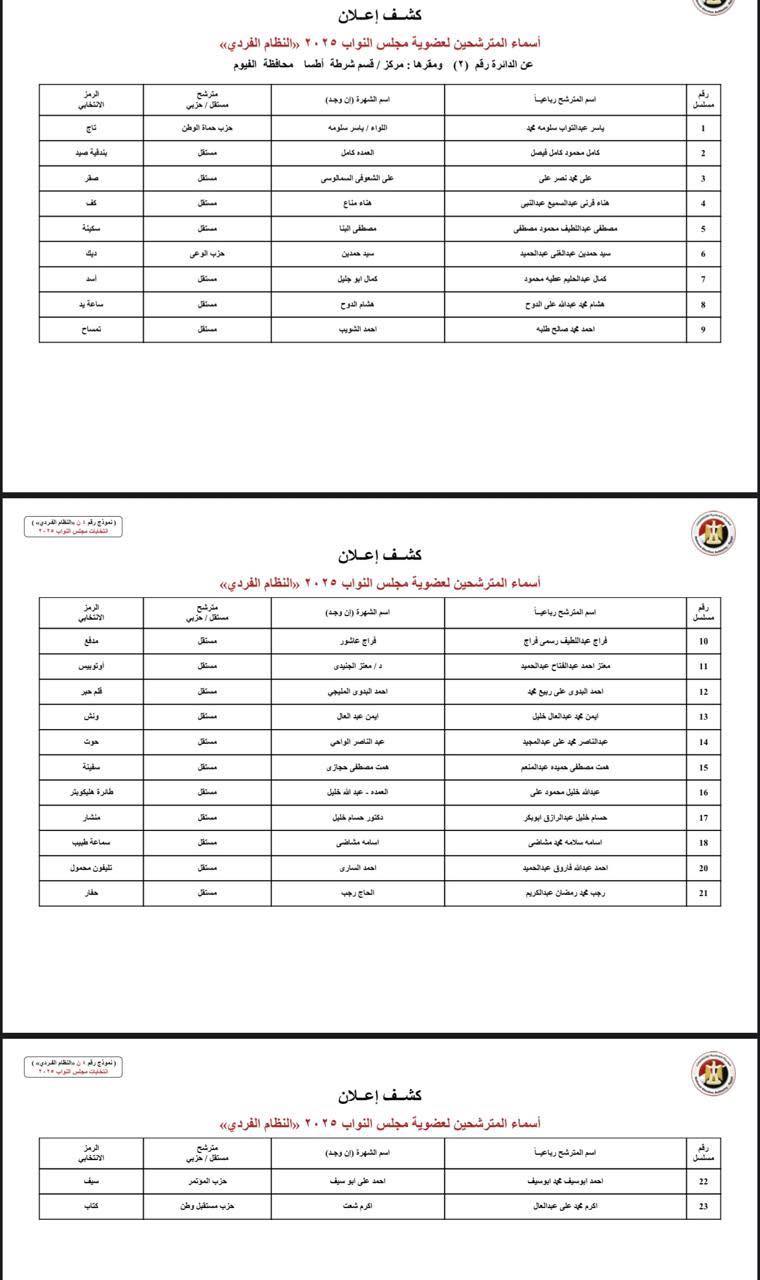 ننشر أسماء المرشحين فى انتخابات النواب بمحافظة الفيوم