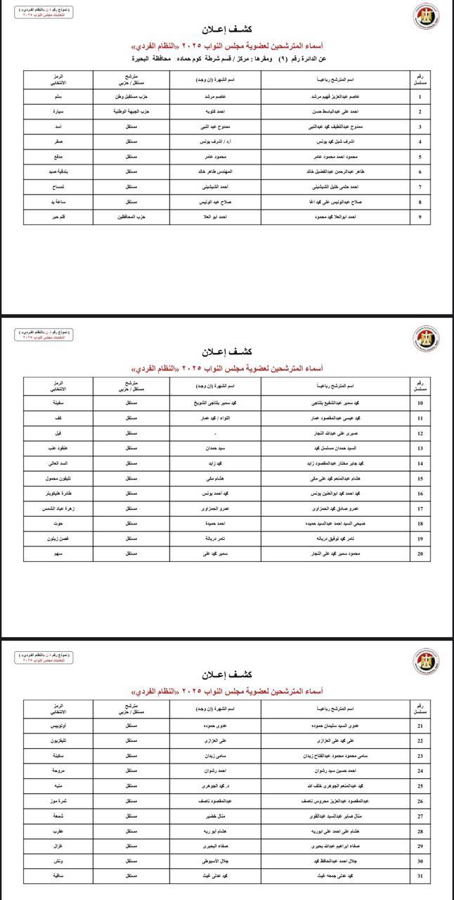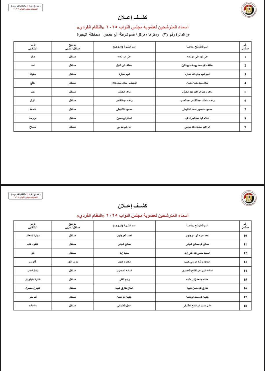 وتضمن الكشفان أسماء المترشحين والصفة التي ثبتت لكل منهم، وحدد الكشف الثاني اسم القائمة التي ينتمي إليها المترشح، على أن يستمر عرض الكشفين على مدار أيام 16 و17 و18 أكتوبر، وتنشرهما الهيئة الوطنية للانتخابات في جريدتي الأخبار والجمهورية.