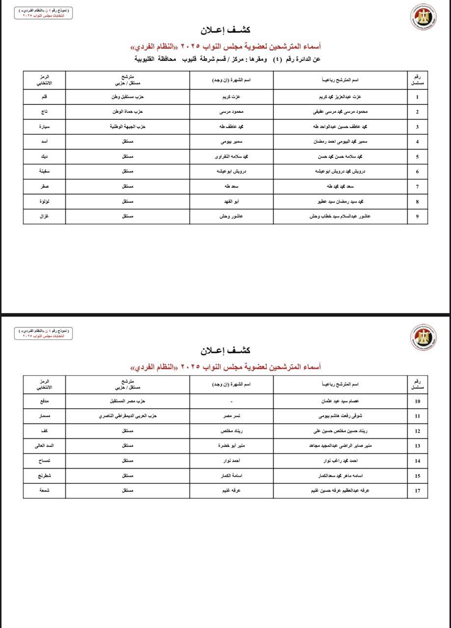 وتضمن الكشفان أسماء المترشحين والصفة التي ثبتت لكل منهم، وحدد الكشف الثاني اسم القائمة التي ينتمي إليها المترشح، على أن يستمر عرض الكشفين على مدار أيام 16 و17 و18 أكتوبر، وتنشرهما الهيئة الوطنية للانتخابات في جريدتي الأخبار والجمهورية.
