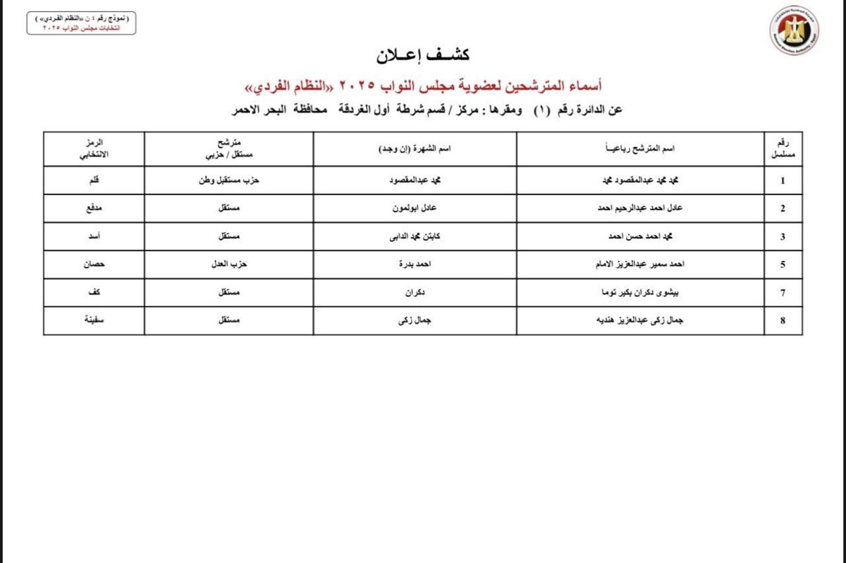 ينشر موقع نيوز رووم بالأسماء المرشحين المتقدمين بأوراق ترشحهم لخوض انتخابات مجلس النواب بـ محافظة البحر الأحمر وتبلغ عدد دوائرها 3 وهي كالتالي: