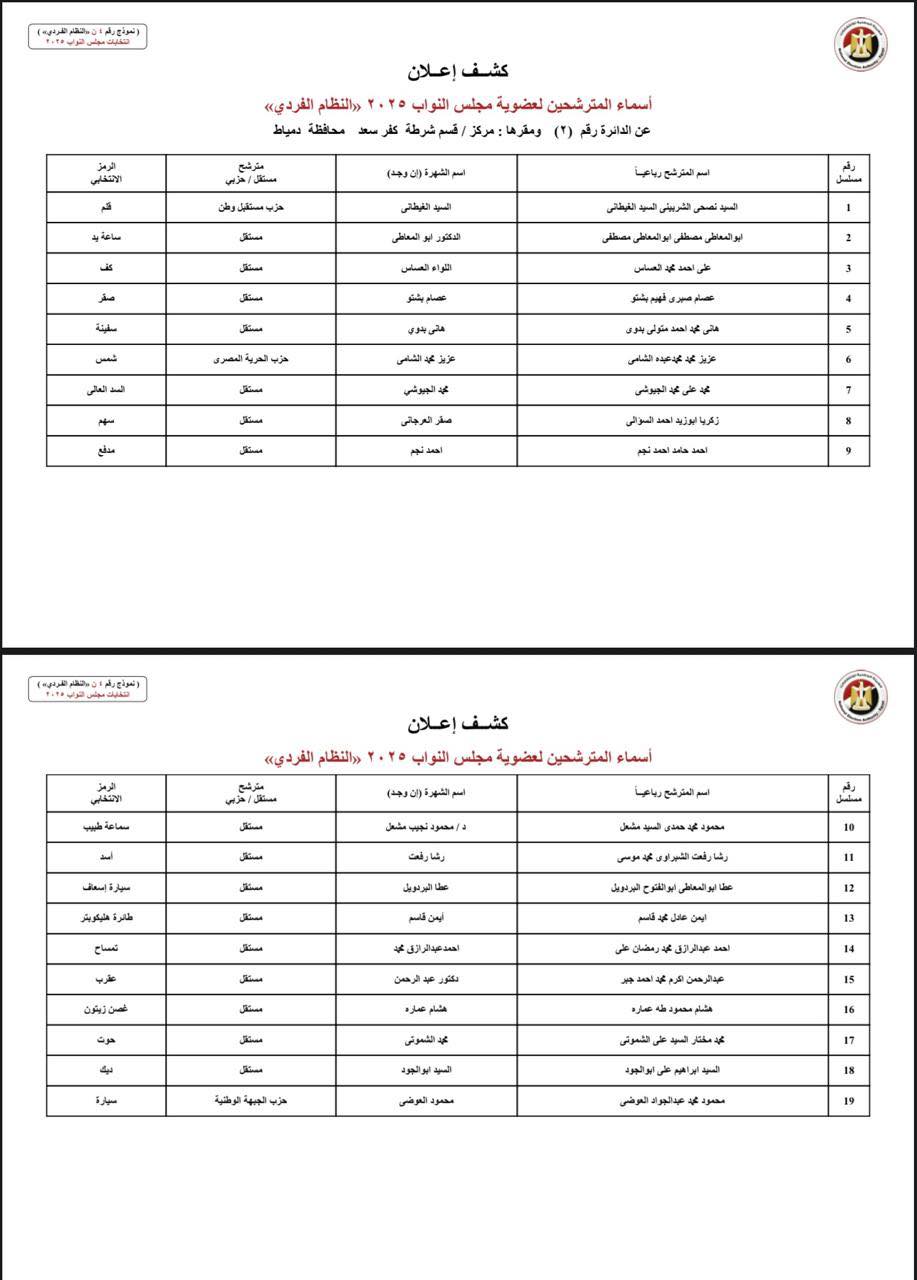 ينشر موقع نيوز رووم بالأسماء المرشحين المتقدمين بأوراق ترشحهم لخوض انتخابات مجلس النواب بـ محافظة دمياط وتبلغ عدد دوائرها 2 وهي كالتالي: