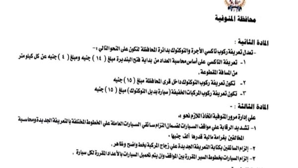هذا وتضمنت المادة الثانية من القرار تعديل تعريفة ركوب التاكسي على أساس محاسبة العداد من بداية فتح البنديرة بمبلغ ( ١٤ ) جنية ومبلغ (٤ ) جنية عن كل 1 كيلو متر من المسافة المقطوعة ، و ( ١٥ ) جنيه تعريفة الركوب الجديدة لمركبات التوكتوك داخل قري المحافظة.