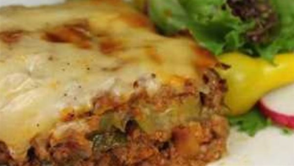 في صينية فرن مدهونة بالزبدة ضعي طبقة من الكوسة، ثم طبقة من اللحم، وكرري حتى تنتهي الكمية