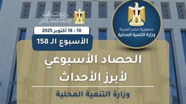 أصدر المركز الإعلامي لوزارة التنمية المحلية "الانفوجراف الأسبوعي" في نسخته الـ 158 حول أبرز أنشطة وفعاليات الوزارة بقيادة الدكتورة منال عوض وزيرة التنمية المحلية، حيث تضمن مجموعة من الفعاليات والاجتماعات ومتابعة المشروعات التنموية المهمة خلال الفترة (10 : 16 أكتوبر 2025).