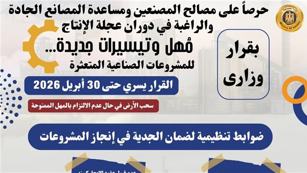 وتسري هذه المهل والتيسيرات التي ستنفذها الوزارة ممثلة في الهيئة العامة للتنمية الصناعية حتى 30 أبريل 2026 وتشمل: