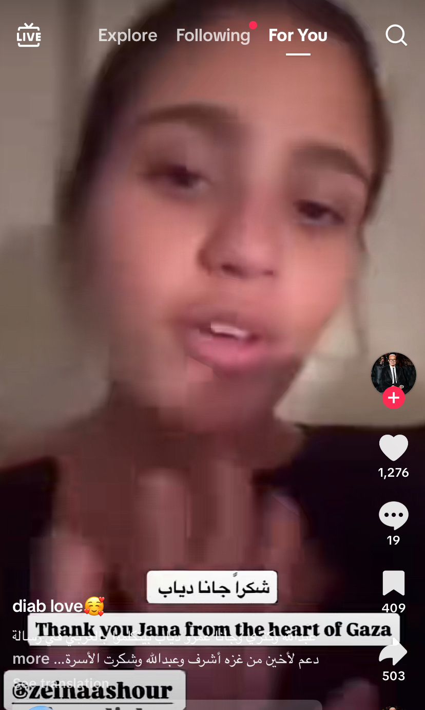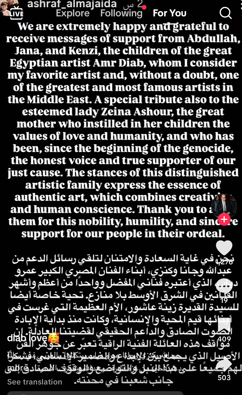 وقال عبدالله عمرو دياب، أن والدته زينة تحب الشعب الفلسطيني وهو يحبهم أيضًا وأضاف “الله يكون معكم”.