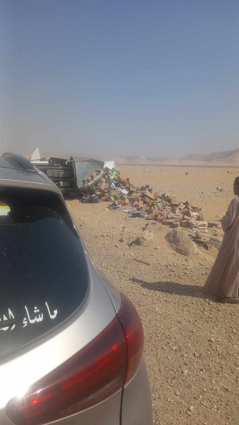 انقلاب سيارة نقل محملة بالمواد الغذائية في طريق نجع حمادي قنا الصحراوي