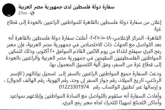 السفارة الفلسطينية بالقاهرة تعلن فتح معبر رفح يوم الاثنين لعودة مواطنيها لغزة