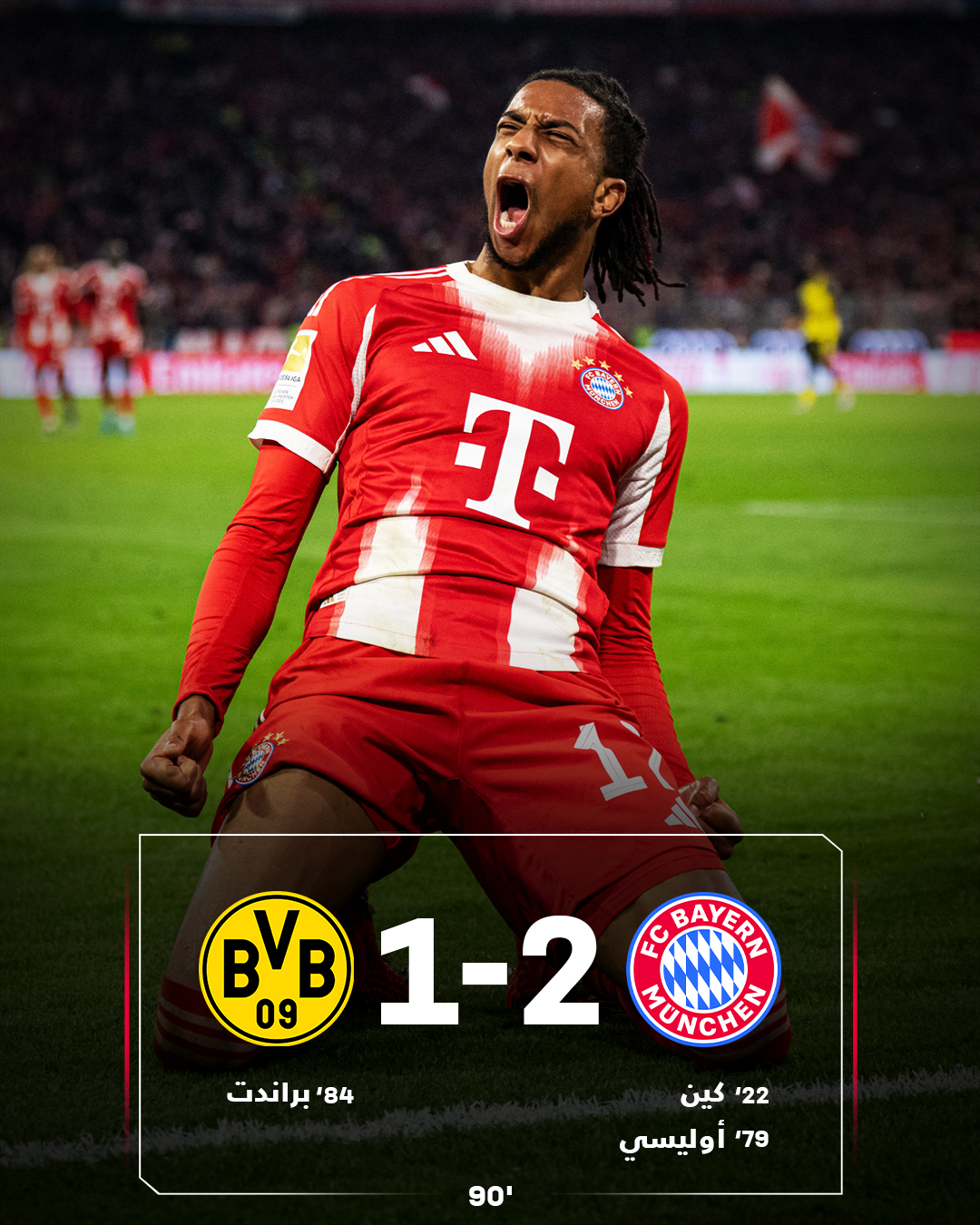 وفي الشوط الثاني، عزز بايرن ميونخ تقدمه عبر الفرنسي مايكل أوليز النتيجة بهدف ثانٍ في الدقيقة 79، قبل أن يقلص جوليان براندت الفارق لدورتموند في الدقيقة 84، دون أن ينجح الضيوف في إدراك التعادل رغم ضغطهم المتأخر.