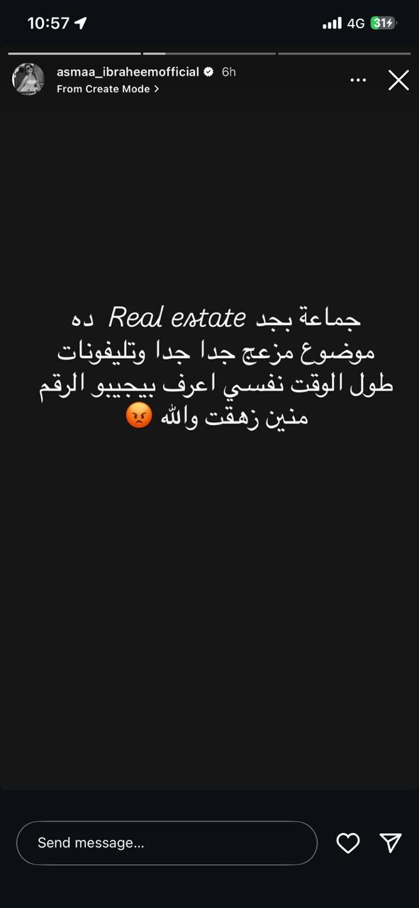 وجاء ذلك في أستوري على حسابها الشخصي بموقع تبادل الصور والفيديوهات "إنستجرام"، قائلة: "بجد موضوع الـReal Estate ده مزعج جدًا جدًا، تليفونات على طول! نفسي أعرف بيجيبوا الرقم منين، زهقت والله".