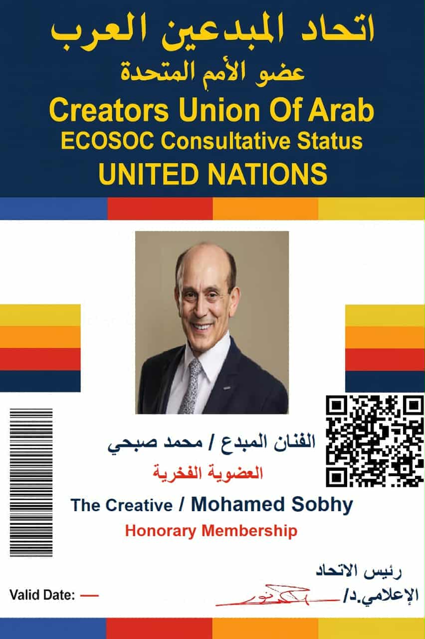 وأضاف الدكتور أحمد نور:“يسرّ الاتحاد أن يمنح الفنان الكبير محمد صبحي أيضًا العضوية الفخرية لاتحاد المبدعين العرب وتبعية الأمم المتحدة ، ليكون لسان الفن والثقافة العربية في المحافل الدولية، وليشارك باسم المبدعين والمثقفين العرب في صناعة القرار العالمي في مجال الثقافة و الفنون انطلاقًا من قناعة راسخة بأن الثقافة والفن هما ركيزتان أساسيتان في بناء السلم والتنمية المستدامة.”