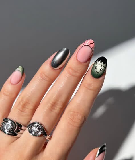 للمرونة والإبداع، جرّبي تأثير الألوان المتدرجة من الأسود إلى الأحمر أو البرتقالي، بحيث تبدو الأظافر وكأنها تشتعل في ألوان النار. هذا التصميم يناسب إطلالات الهالويين المستوحاة من النار أو السحر، ويمنح الأظافر عمقًا وحركة، كما أنه مثالي لمن يحبون الابتكار والتجديد بعيدًا عن الرسومات التقليدية.