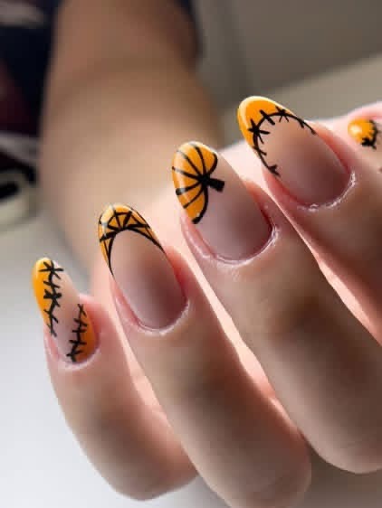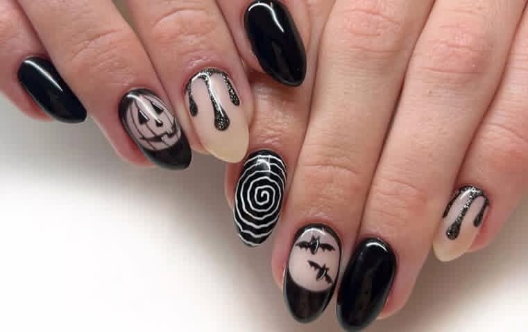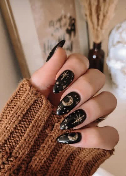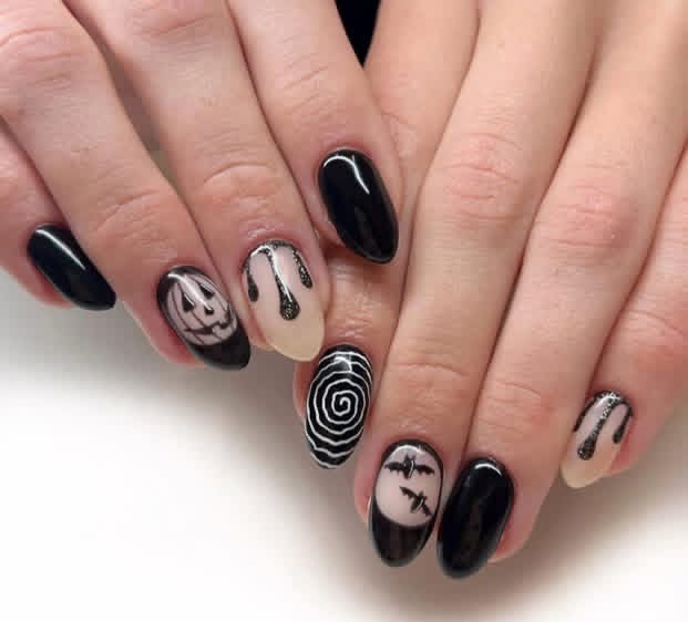 الأسود هو اللون الكلاسيكي للهالويين، فهو يضفي شعوراً بالغموض والأناقة في آن واحد. لكن لإضفاء لمسة فخامة، يمكن دمج خطوط أو نقاط ذهبية دقيقة على أظافر اليدين. هذا التصميم مثالي لمن تبحث عن مظهر راقٍ وعصري، يمكن تنسيقه مع ملابس باللون الأسود أو البرتقالي الداكن لإبراز التباين واللمسة الاحتفالية.