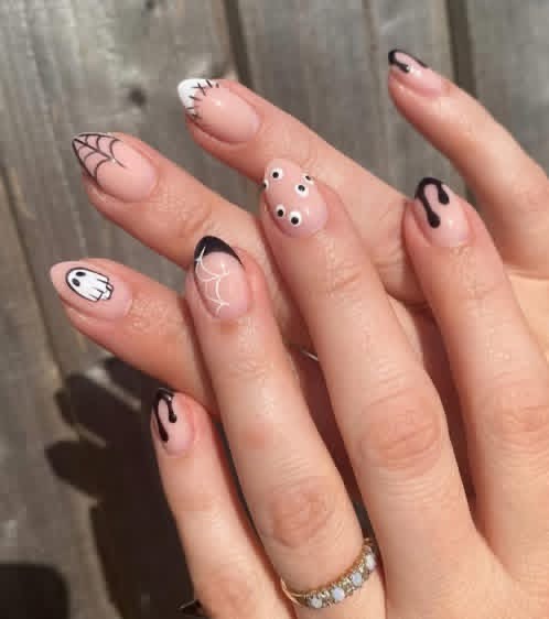 إذا كنتِ تفضلين المظهر الناعم والمثير في الوقت نفسه، فالطلاء الأبيض الشفاف مع لمسات من البريق أو الحبيبات اللامعة هو الخيار الأمثل. يمكن إضافة رسومات صغيرة مثل الأشباح أو النجوم الفضية للحصول على تأثير سحري يناسب الهالويين دون الإفراط في الجرأة. هذا الأسلوب يناسب الأظافر القصيرة والطويلة على حد سواء، ويمنح اليد مظهراً أنيقاً وعصرياً.