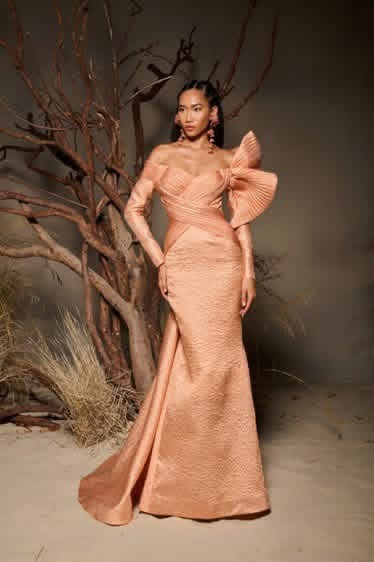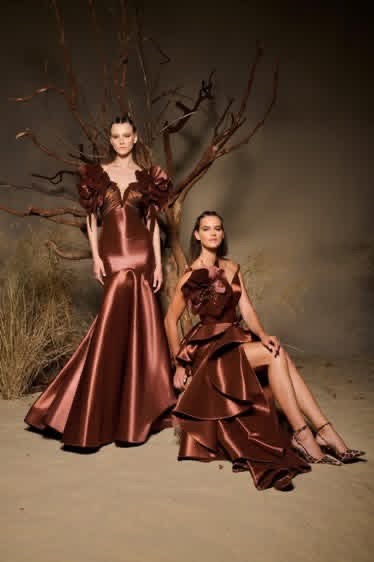عملياً، تحتفي القصّات بجسد المرأة كفنٍّ حيوي، حيث تعكس كل انحناءة، شجاعة المرأة وحريتها وصلابتها. وتستحضر ألواناً قوية مثل الاسود والذهبي والبرونز، مستوحاة من المعادن، وعي القيمة المعنوية للطبيعة، فيما أضيفت لمعاناً استثنائياً عبر أحجار تتلألأ فوق الخامات، في تطريز يضفي أنوثة وحيوية.