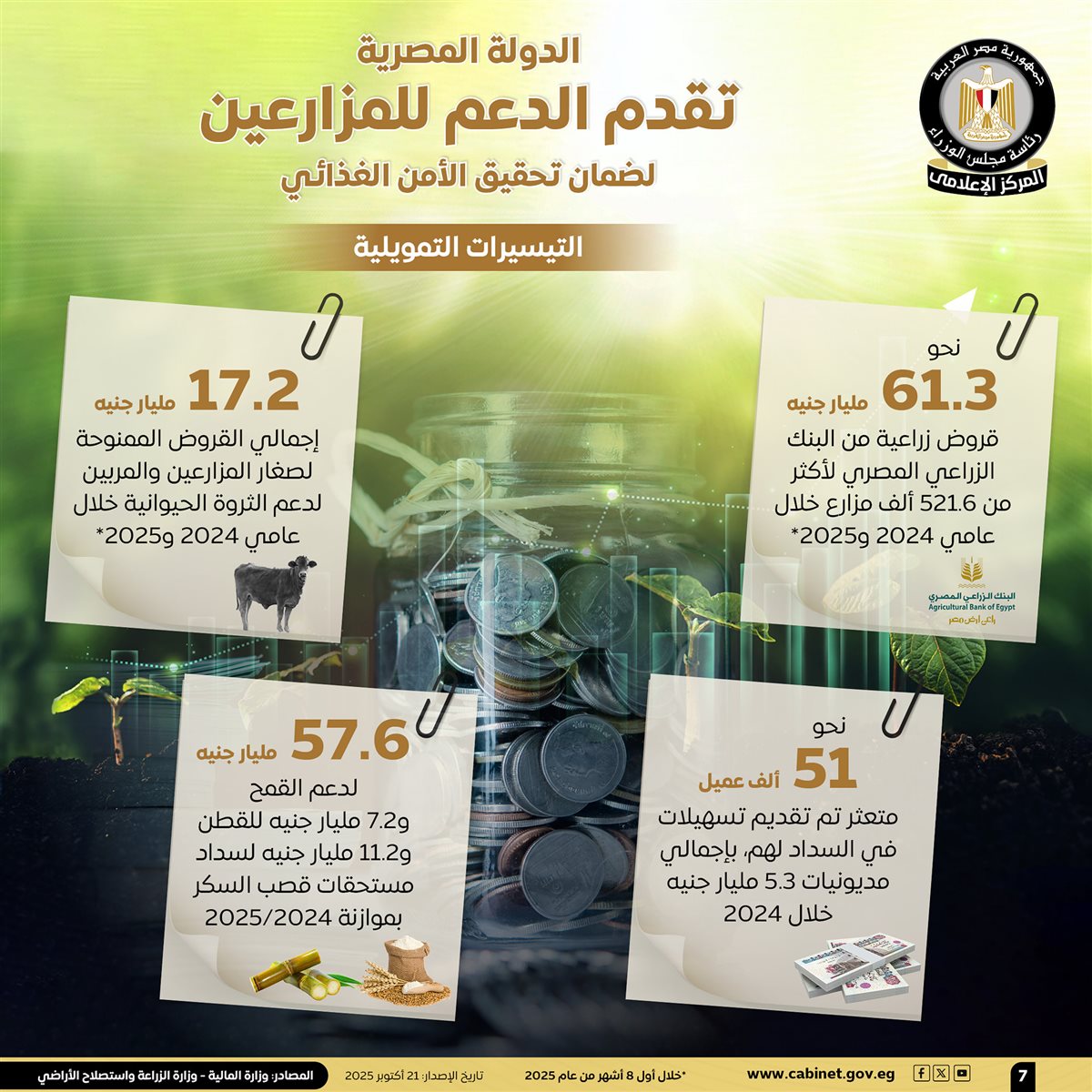 وأشارت الإنفوجرافات إلى أن إجمالي القروض الممنوحة لصغار المزارعين والمربين لدعم الثروة الحيوانية بلغ 17.2 مليار جنيه خلال الفترة من عام 2024 حتى أول 8 أشهر من عام 2025، كما تم تقديم تسهيلات في السداد لنحو 51 ألف عميل متعثر، بإجمالي مديونيات 5.3 مليار جنيه خلال عام 2024، في حين تم إتاحة 57.6 مليار جنيه لدعم القمح، و7.2 مليار جنيه للقطن، بالإضافة إلى 11.2 مليار جنيه لسداد مستحقات قصب السكر بموازنة 2024/2025.