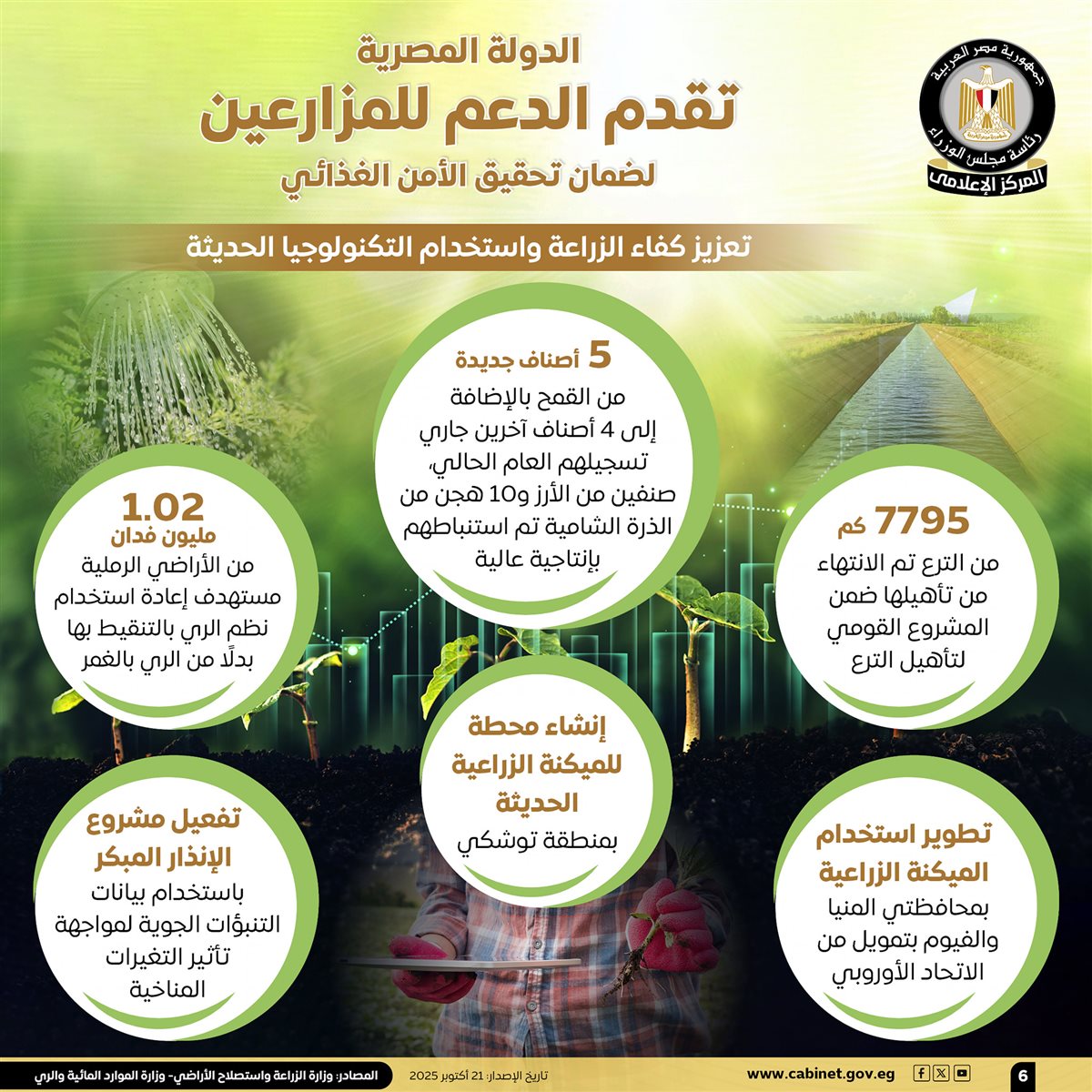 نشر المركز الإعلامي لمجلس الوزراء إنفوجرافات عبر منصاته على مواقع التواصل الاجتماعي، استعرض خلالها أبرز أوجه الدعم الذي تقدمه الدولة المصرية للمزارعين، لضمان تحقيق الأمن الغذائي.