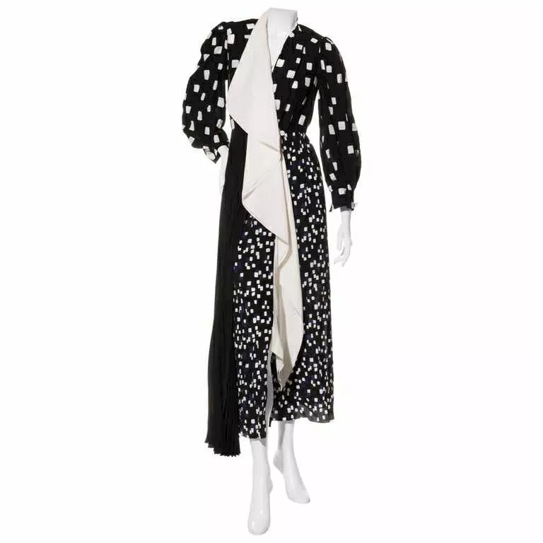 والفستان مصنوع من الحرير الطبيعي، بنقشة polka dots بالأبيض والأسود على النصف الأيسر، بينما يهيمن على النصف الأيمن اللون الأبيض النقي مع طبقات ruffles غير متماثلة تنساب بانسيابية لافتة، مانحة الإطلالة حركة ديناميكية.