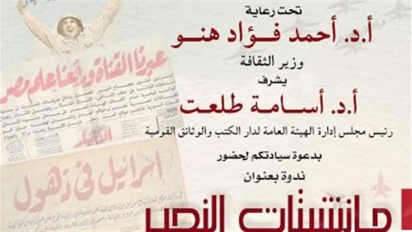 في إطار احتفالات وزارة الثقافة بذكرى انتصارات أكتوبر المجيدة، تنظم الهيئة العامة لدار الكتب والوثائق القومية برئاسة الأستاذ الدكتور أسامة طلعت ندوة بعنوان، «مانشيتات النصر: الصحافة القومية في قلب معركة أكتوبر»، وذلك في تمام الثانية عشر ظهر الأربعاء 22 أكتوبر، بقاعة دار الوثائق، وعلى هامش الندوة يقام معرض لمانشيتات الصحف التي وثقت النصر.
