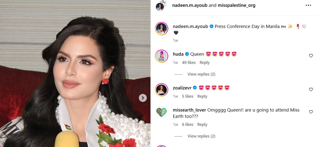 وجاء في المنشور: "نحن فخورون للغاية بدعم أول ملكة جمال فلسطين على الإطلاق للمشاركة في مسابقة ملكة جمال الكون.